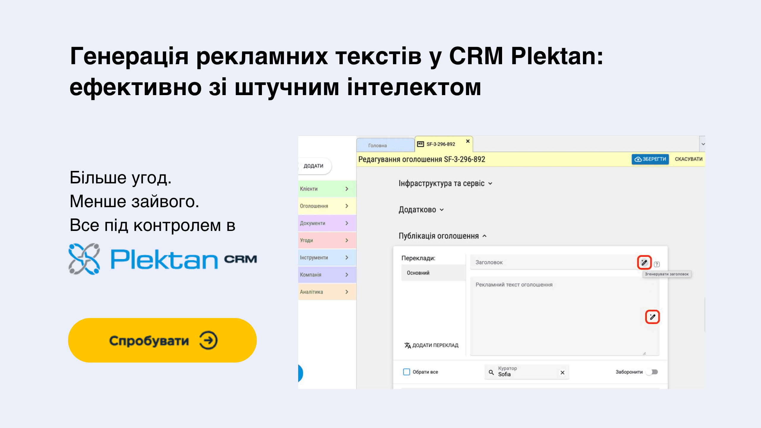 Створення якісного рекламного тексту — це те, що часто забирає час у рієлтора. Підібрати правильний заголовок, описати об’єкт, виділити переваги — усе це важливо, але не завжди є ресурс робити це з нуля для кожного оголошення.